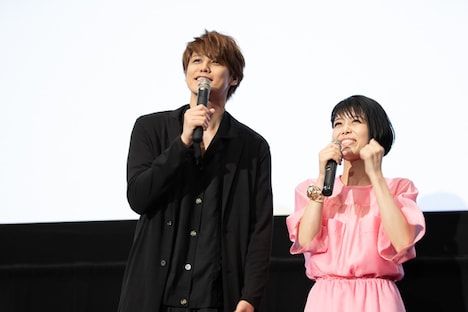 続けて登壇者たちは、本作にちなみ「最近『絶対絶命の危機かも』と思ったこと」をテーマにトークを展開していく。宮野は「今朝すごくお腹が痛くて、車の中で絶対絶命のピンチを迎えそうだったけど、なんとか大丈夫でした」と笑う。隣の沢城が「あっ、ウンチつながりで言うと……」と語りだすと、宮野は「俺は言ってないよ! マシュマロしか出ないから! イチゴ味だよ!」と矢継ぎ早にツッコんだ。昨年出産した第1子を子育て中の沢城は「おむつ外しちゃったのに、手元におしりふきを用意してない」という絶対絶命秘話を紹介する。そして、6月2日に誕生日を迎える沢城と、6月8日生まれの宮野にスタッフからの花束が贈られ、観客が「おめでとー!」を声をそろえた。