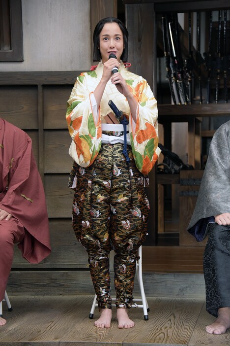 本木は「あぐらがつらい、ひげがかゆい、撮影現場は熱帯雨林」と冗談交じりに愚痴をこぼしながら、長谷川との共演を「とても新鮮。まだ役の関係上でも役者としても、お互いを探り合いながら関係を詰めていくという段階です」と説明。沢尻が「とにかく道三がカッコいい」と昨日の撮影を振り返ると、本木は「芝居の熱量という意味では、沢尻さんがギラギラしていてピカイチでした。初日の緊張感を含め、今しかないという輝きを放っていました」と称賛した。