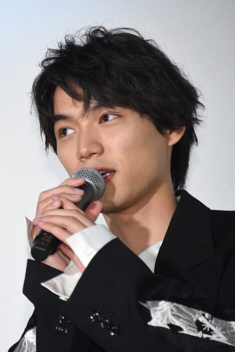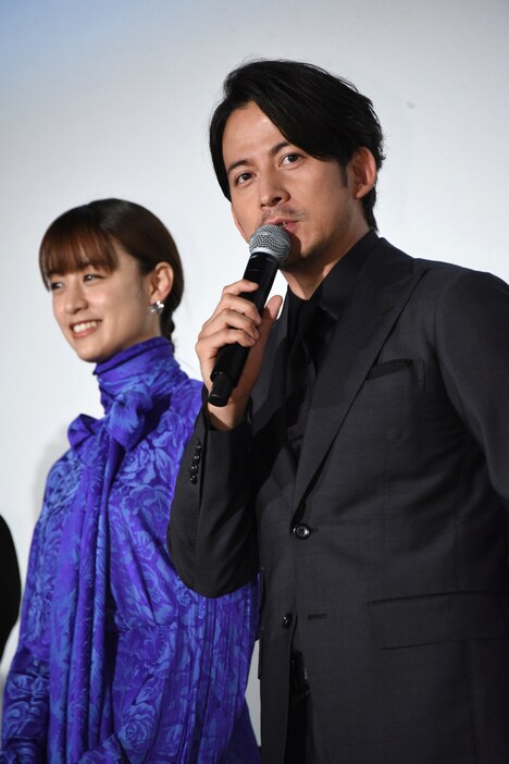 佐藤浩市が岡田を「准一」と呼んでいることをマネて、「准一さんじゃないですかね……」とちゃっかり答える福士。そして「やっぱり異常……というか普通じゃないんです(笑)。あんなに壁をスムーズに登るなんてできないです」とスタントなしでアクロバティックなアクションを披露している岡田の身体能力に言及した。