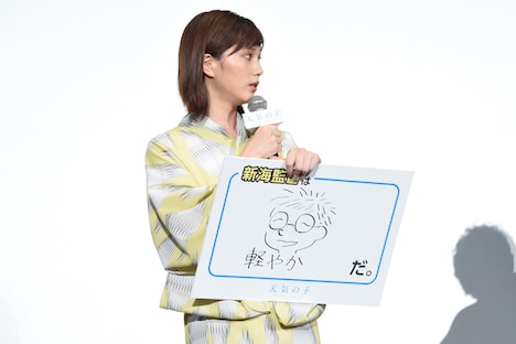 女子大生・夏美役の本田は「軽やか」という文字とともに新海の似顔絵を描いた。「軽やかに我を通す人です」とほほえむと、新海は「翼さんは、僕では想像がつかなかった夏美をくれたんです」と本田とのアフレコを振り返った。最後に「抜群」という答えを挙げたのは、帆高を雇うオカルト雑誌のライター・須賀圭介役の小栗。ビデオコンテにはほぼ新海の声が吹き込まれていたことを明かし、「監督の声ができあがっていたので、須賀に関しては監督の声で表現されていたこと以外ほぼ何もしていないんです。声優やればいいのにって思ってます」と才能を絶賛。照れながら否定する新海は小栗との飲み会を回想し、「小栗さんはひょうひょうとしていて、何をお願いしてもスッとやってしまう。でも飲んだときに、ビデオコンテを何度も聞いて猛練習してきたと話してくれて。そんな話を制作が終わってからするんですよ」と述懐。「なんて素敵な人なんだろうと思って感激しました」と褒め返していた。