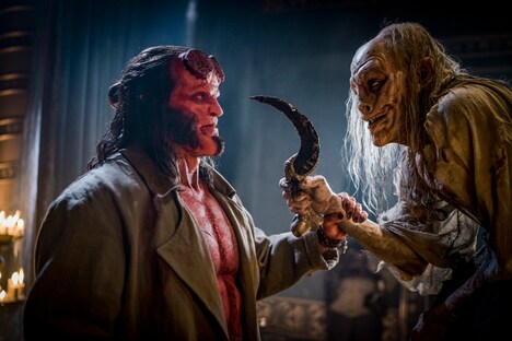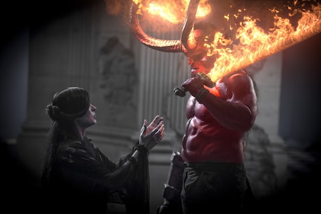 映像は、ブラッドクイーンが人間界を滅ぼすべく地獄のモンスターたちを招集するシーンからスタート。その後、ヘルボーイがB.P.R.D.の仲間とともにモンスターたちと激しい戦いを繰り広げるさまが映し出されていく。また「お前の中の悪魔を覚醒させる」と言うブラッドクイーンに、ヘルボーイが「冗談じゃねえ。俺はヒーロー、あんたはクソッタレ!」と切り返す様子も。本ビジュアルには、燃え盛る炎の中で、トレードマークの削られた角が生えた状態のヘルボーイが剣と銃を手にする姿が捉えられている。