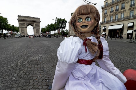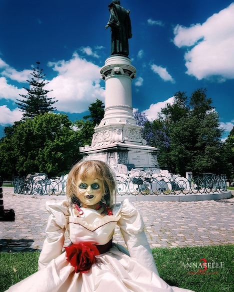 写真には、アナベルがフランスのエッフェル塔や凱旋門、ポルトガルのリスボンで観光を楽しむ様子や、メキシコのマリアッチとともに記念撮影をする姿が。さらに、包丁を持つアナベルと、殺人人形チャッキーを思わせる赤毛の人形が彼女の傍らに倒れる画像も公開された。「チャイルド・プレイ」の海外版ポスターではアナベルを殺害していたチャッキー。今回チャッキーへの反撃に成功したアナベルは、満足そうにほほえんでいる。