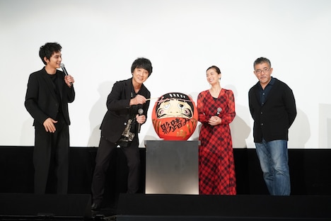 イベント終盤には、本作の撮影地である群馬の名物・高崎ダルマがステージへ運び込まれた。映画のヒットを祈願して用意されたこのダルマは、山崎の似顔絵が描かれたもの。山崎が登壇者を代表してダルマの目入れをすると、墨が滴るハプニングが起こったが、山崎と北村は「涙が流れるシーンを再現したんです!」と息ぴったりの様子でフォローをした。