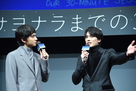 新田演じるアキは、北村扮する颯太にだけ見えるというキャラクター。新田が「みんなから見えていないのは、ちょっとさみしいところがありました」と言いながらも親しげな様子で北村の肩に手を置くと、客席から歓声が上がり、北村は「みんなに勘ぐられちゃうから」と焦る。続いて北村は「ずっとこうだったんです」と颯太とアキを演じ分ける難しさを体を前後に動かして表現し、「今でもあの頃に戻りたいくらい楽しかった」と撮影時を懐かしんだ。