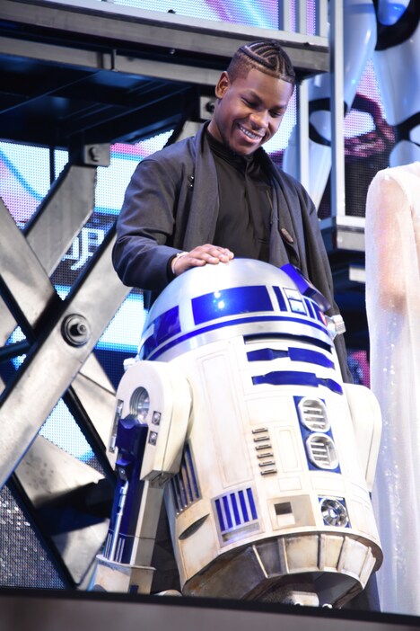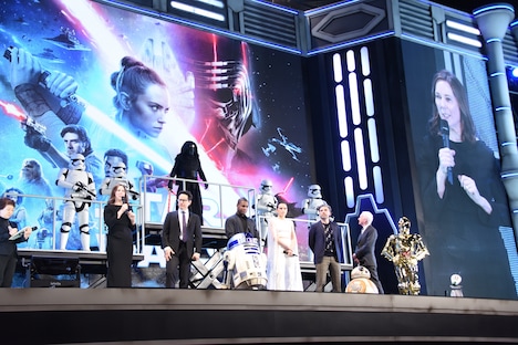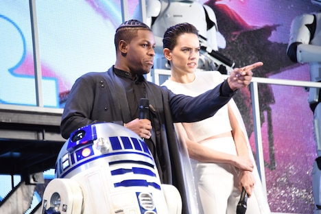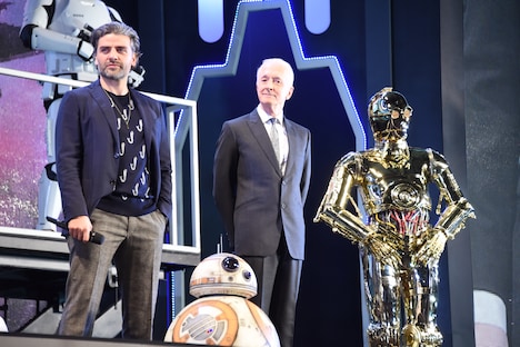 続いてステージでリドリーらが顔をそろえ、会場の人々をより一層興奮させる。彼らと一緒にC-3PO、R2-D2、BB-8、カイロ・レン、ストームトルーパー、そして新キャラクターのD-Oも登壇した。エイブラムスは「日本に来られて本当にうれしいよ。ステージに並んでいるみんなが素晴らしい仕事をしてくれたから、早く観てもらいたいんだ」と挨拶。リドリーは「日本に来られてうれしいです!」と日本語で話しファンを沸かせ、アイザックは「日本が大好き。みんなのことも大好きだよ! 今日はありがとう!」とハイテンションで心境を語った。