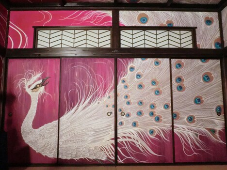 「リアルを追求するより、少しアートに振りたかった」と話したのは美術監督の相馬直樹。座敷に使用された大きく波打つ立体的な壁は、本作参加前に行ったスウェーデンで目に入った外壁からインスピレーションを受けて作ったものだと言い、「立体感を出そうとするうちに作っては壊してとなって……(笑)」と試行錯誤した様子。さらに鮮やかなピンク色に塗られた壁や襖から天井にまたがって大きなクジャクが描かれている歌麿の部屋についても言及する。以前チェコで訪れたピンク色のカフェからヒントをもらったと前置き、「ピンクって日本の時代劇ではなかなか使われないんですが、カフェを見てこの色はいいなと。クジャクは歌麿の色気のモチーフとして入れました。職人の方に描いてもらった画を和紙に拡大出力して部屋に貼り、さらにその上からもう一度描いてもらって……1週間くらい掛かっていますね」と制作過程を振り返った。