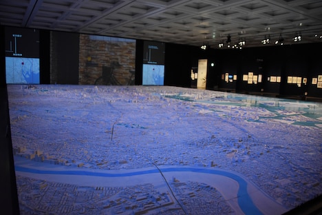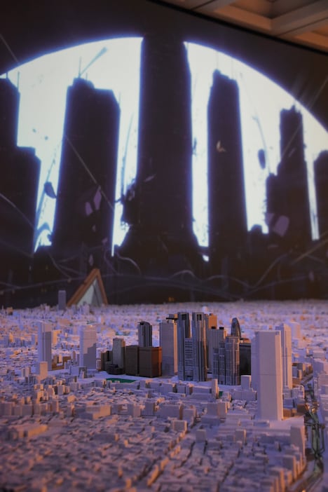会場中央部には、イントロダクションとして巨大なスクリーンと1/1000の縮尺で再現された東京の都市模型が。スクリーンには
