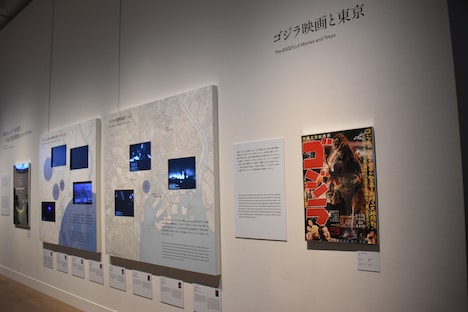 「破壊と復興の反復」をテーマとするセクション1では、東京の大規模な破壊や、そこから復興してできた新しい都市風景を描いた作品にスポットを当てる。「ゴジラ」シリーズでは、東京都心部の地図上に初代ゴジラが襲撃した場所を表示したほか、「ゴジラによる東京の破壊の反復(1984~2016)」と題し、シリーズ化によって都度ゴジラに破壊されてきた街を映像とともに解説。このほか「AKIRA」、庵野が総監督を務めた「ヱヴァンゲリヲン新劇場版」シリーズ、大友による短編「火要鎮」などの制作資料と映像が紹介された。