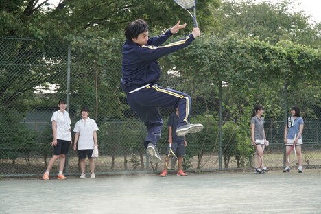 写真には、小説の取材をするためテニス部を訪れた2人が、ダブルスを組んで部員と対決するシーンが切り取られている。決して目立つタイプではない不器用な一也と、才色兼備の詩凪という立場も性格も異なる2人。試合終わりに一也と詩凪が互いに拳を向け合うカットも。