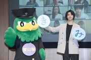 青山学院大学マスコットキャラクターのイーゴくんとハイタッチする横浜流星。 [拡大]