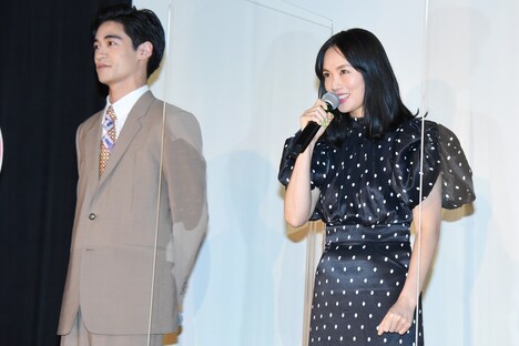 イケメン好きのみつ子の先輩・ノゾミを演じた臼田は、印象的な大九の演出を聞かれると「(若林扮する)イケメンのカーターを見たときにそのとき食べてるランチのお味噌汁で口をすすぐという……。とても上品ではない行為をさせていただきました(笑)」と回答。また、若林は役作りに関して「初歩的なところですが、歩き方を伸び上がるようなモデル歩きにしたりとか。高校時代に僕、かっこつけててそういう歩き方してたんですよ。その頃を思い出しました」と語った。