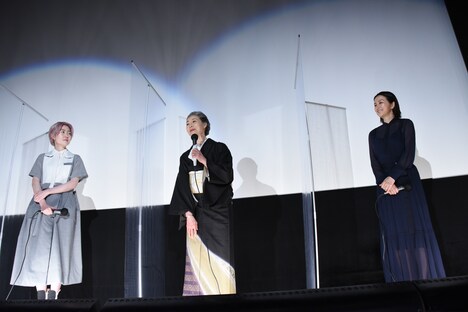 渚の叔母・陶子を演じた鈴木は、昔から富司に憧れていたことを告白。「理想の女性像がますます高いイメージになってしまいました。富司さんのように時間を重ねていけたらいいなと思いますが、あまりに理想的すぎて……」と共演の感想を述べ、「憧れの女優ナンバーワンの座が塗り替えられました」と笑顔に。シムに対しても「ウンギョンちゃんは、新しい世界に1人飛び込んで来る渚と姿が重なり、切ないくらいにきれいでした」と声を掛ける。撮影の日々を懐かしむ鈴木とシムに、富司も「1年を通じて撮っていただいたのに、あっという間に終わってしまいました。本当の家族のようで楽しかったです。この作品に、そして監督に出会えたことを感謝いたします」と同調した。