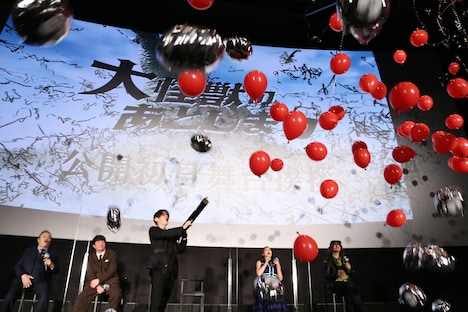 続いて、巨大怪獣の隆起を模した巨大風船が劇場内に出現。山田は「(撮影時のランチャーも)これぐらい軽かったらなあ」とほほえみながらバズーカで巨大風船を狙撃し「(劇中でも)こんなに簡単に始末できたらいいなと思いました。映画だと苦戦していましたから」と笑った。