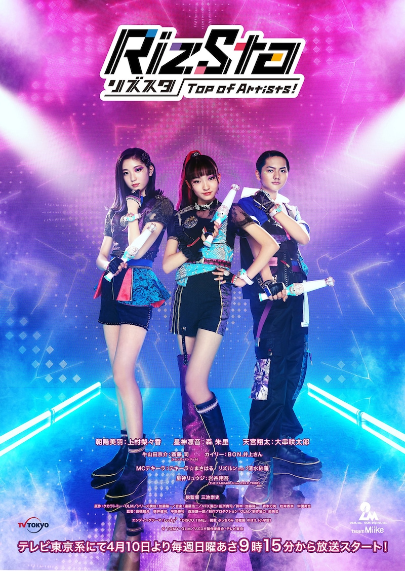 アーティストグループの“リズスタ”を結成する3人のメインキャストは本作でデビュー。 上村梨々香が努力家で負けず嫌いの14歳・美羽、森朱里が自分にも他人にも厳しいクールな凛音、大串咲太郎が明るく元気なムードメーカー・翔太に起用された。