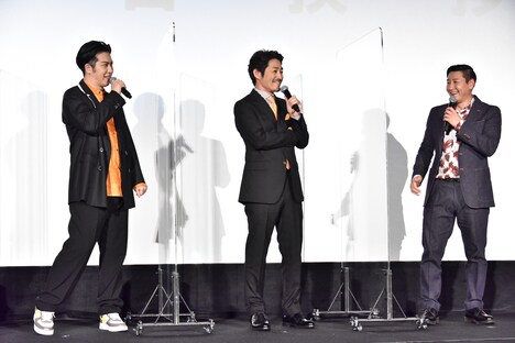 バッドガイズのチームカラーであるオレンジをワンポイントにあしらった衣装で登場したキャスト陣。松也は「アフレコ収録ではほかの方の声が入っていない場合もあるので、1人で作品の世界観を作らなければいけないのが大変。しかも『バッドガイズ』はセリフのテンポがいいので、そのテンポに遅れてもいけないし、みんなで息を合わせて作らなければいけないので難しかった」とアフレコでの苦労を明かす。安田も「僕のアフレコ時も皆さんの声が吹き込まれていなかった。耳からは本国の英語セリフが聴こえてくるのでリアクションに戸惑いました」とコメントした。