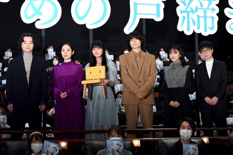 最後に原は「自信を持って、誰が観ても絶対に楽しんでもらえると言い切れる、そんな素晴らしい作品に出会えたことが本当に誇りです。監督、すごい映画を作ってくださってありがとうございました」と感極まりながら思いを伝える。松村も「愛し方が変わりながらいつまでも仲良くしていけるような映画です。“1回観た”という縁を宝物のように思っていただけたら」とアピール。そして「せっかくなのですずめさん。あの言葉を聞いていいですか?」と合図を出し、原の「行ってきます」というセリフをもって舞台挨拶の幕が降りた。