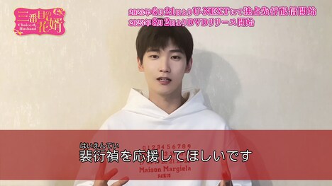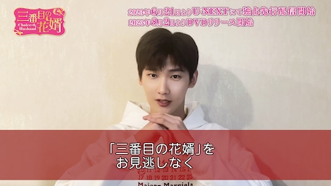 シン・ジャオリンは映像の中で、本作について「見どころが多い作品で、物語は二転三転します。まず戯曲をたくさん取り入れています。それから2人の男が元妻を取り合うので、アクションも満載です」と紹介。そして「『三番目の花婿』を好きなって、裴衍禎を応援してほしいです!」と呼び掛けた。