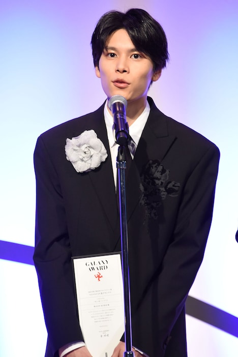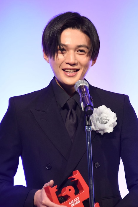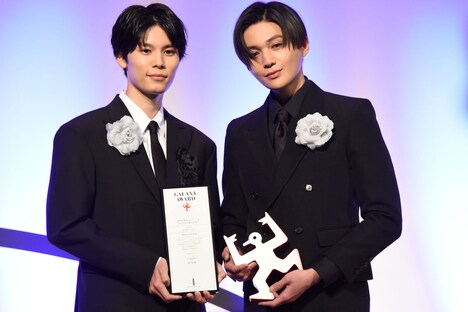 平良一成役の萩原は「またこの場に立ててありがたいです。今日は舞台挨拶もしてきたんですけど、本当にたくさんの視聴者の方に『おめでとう』と言っていただけて。喜んでくださる方がいるのは作品を作るうえでものすごい力になるんだなと再び実感しています」と胸いっぱいの様子。そして唐突に「全然関係ないですけど、僕、某サッカーゲームをやっていまして。いつもお声を聞いております。素晴らしい実況を……」と司会のジョン・カビラに伝え、カビラから実況風のセリフが繰り出されると、よりいっそう感無量な表情を浮かべた。そんな姿を横目に、清居奏役の八木は「皆さんの愛をまっすぐ感じられました。こうして2人でステージに立たせていただけるのも、『美しい彼』チーム全員の代表として素敵なトロフィーをいただいていると思うと光栄です」と噛み締め、「2人の時間を生きていることを毎日撮影で感じられて楽しかったです。今でも鮮明に覚えています」とほほえんだ。