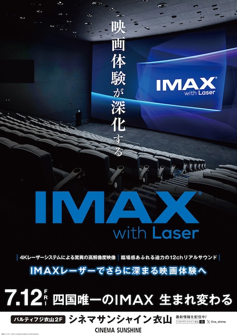なお導入工事に伴い、シネマサンシャイン エミフルMASAKIのシネマ7は6月14日から7月11日にかけて休館。シネマサンシャイン衣山のIMAXデジタルシアターは6月7日から7月11日まで休館となる。