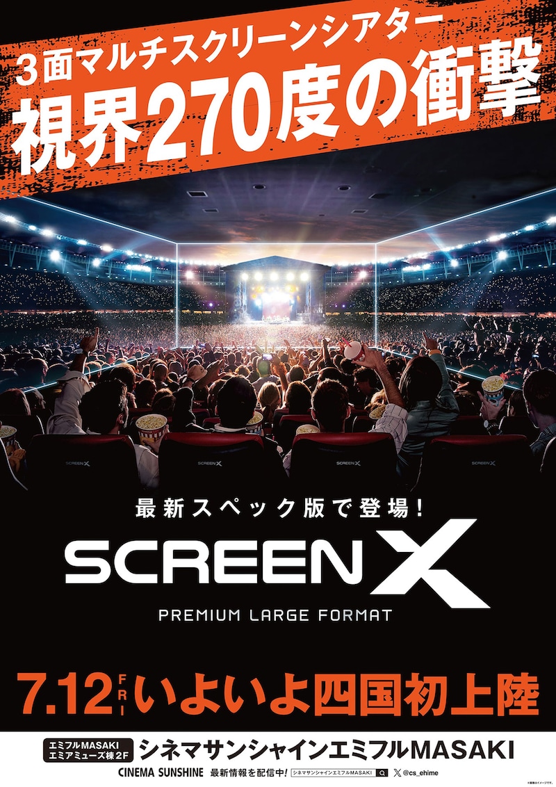 シネマサンシャインが四国地方初のプレミアムシアターを愛媛・シネマサンシャイン エミフルMASAKIとシネマサンシャイン衣山に導入。エミフルMASAKIには3面マルチスクリーンシアター「ScreenX PREMIUM LARGE FORMAT」、衣山には「IMAXレーザー」が7月12日に導入される。