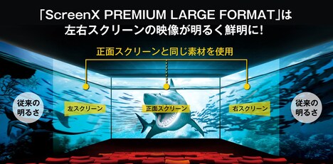 ScreenXの最新スペック版となる「ScreenX PREMIUM LARGE FORMAT」は、従来の正面スクリーンに加えて左右の壁面にも映像が投影され、270度の視界で映画を楽しめる上映システムだ。高性能プロジェクターで左右それぞれから投影されることで、より明るく鮮明な映像が実現する。