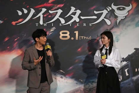 家族や友人を映画に誘うならどんな誘い文句がいいかを考えるプレゼン対決も。小芝が圧倒的な“竜巻モンスター”と対峙する体験の魅力を打ち出したかと思えば、津田は「ゴゴゴゴゴ ブォー!! ワー!! ギャー!! …ジーン」と擬音だけで紹介。小芝も大いに笑いながら「擬音で言うとそうですね(笑)。最後の“ジーン(とくる)”がいいですね。迫力だけじゃなくて人間ドラマがちゃんとある」と納得の様子を見せた。