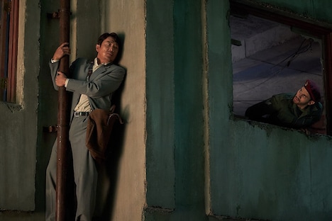 このたびYouTubeで解禁されたのは、武装組織に追われるミンジュンが、ベイルートの闇夜で危機に陥るシーン。滞在していた部屋を窓から出て排水管につかまりながら身を隠していた彼は、ビル5階付近から地上にいるパンスに救助を求める。だがパンスは焦った様子でタクシーに乗り逃亡。そして排水管が折れ、ミンジュンは落下してしまう。