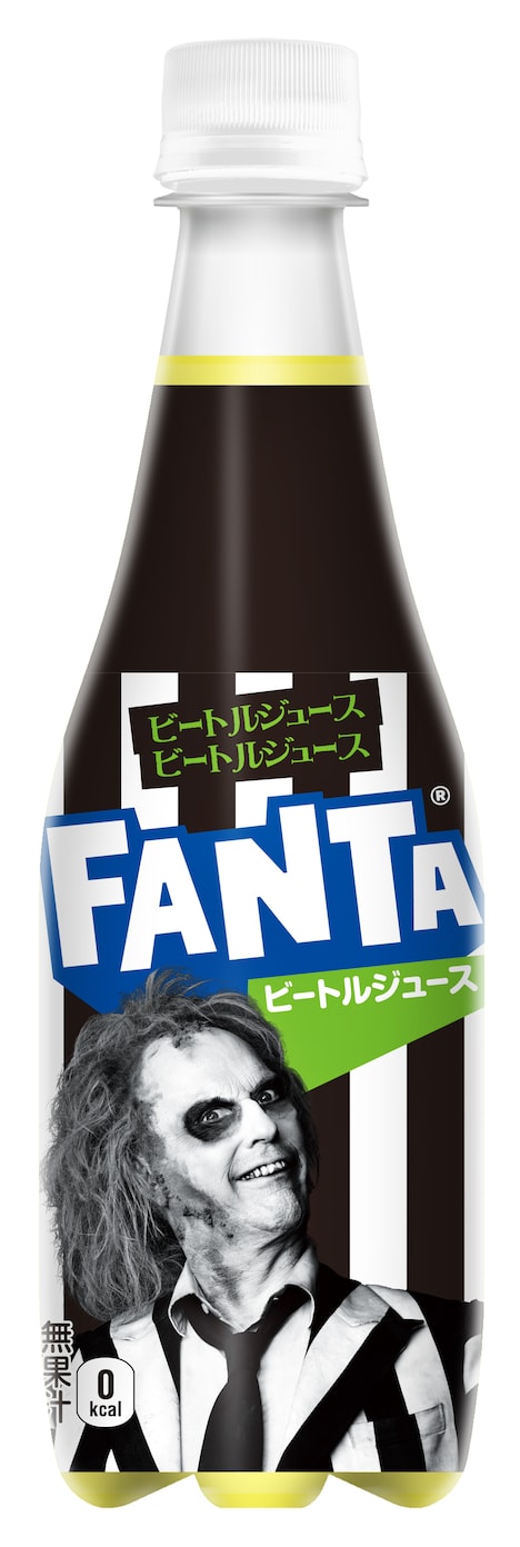 「ファンタ ビートルジュース」は“あの世のおいしさ”を表現したもの。液体のカラーはネオンイエローで、ボトルには不敵な笑みを浮かべるビートルジュースがあしらわれている。