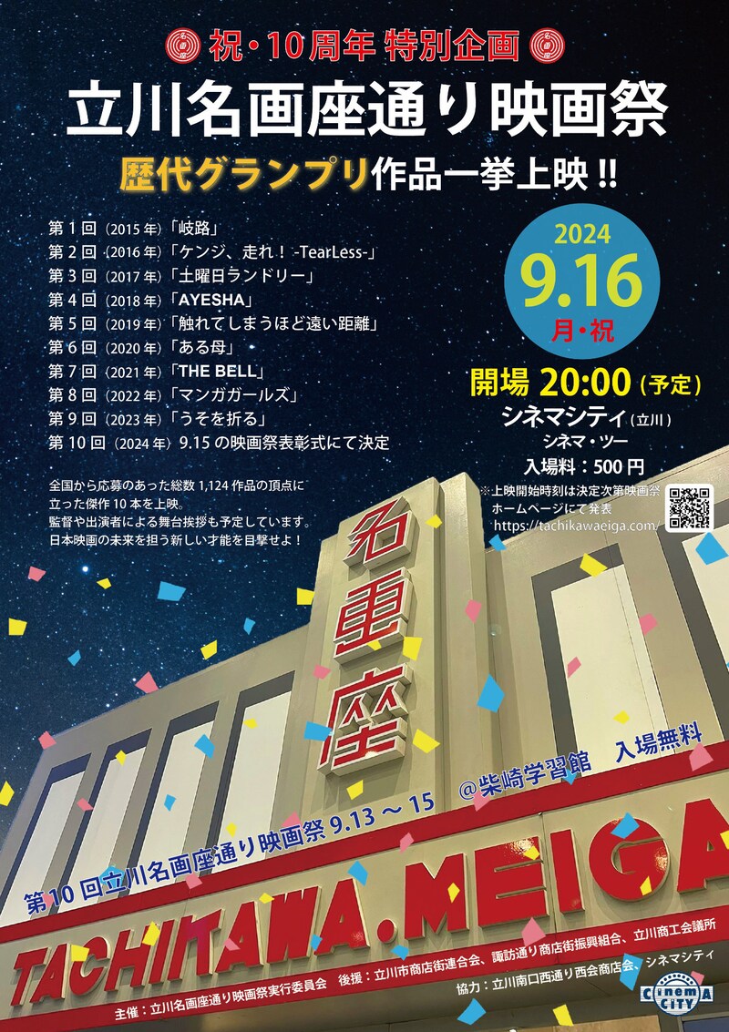 2015年に市民の手により自主制作映画の祭典としてスタートした立川名画座通り映画祭。10周年を記念した本イベントでは、9月13日から15日にかけて開催される第10回のグランプリ作品を含めた10本がスクリーンにかけられる。明日9月6日に「とりつくしま」の公開を控える