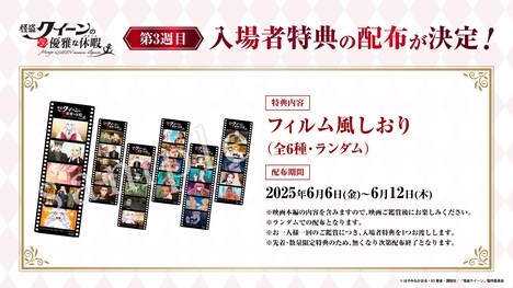 「怪盗クイーンの優雅な休暇」は新宿バルト9ほか全国で上映中。なお6月6日から12日まで入場者特典第3弾として「フィルム風しおり」の配布が決定した。クイーン、ジョーカー、RD、初楼といったキャラクターの名シーンが切り取られており、数量限定・全6種ランダムでの配布となる。
