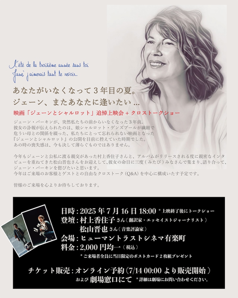 イベントには、バーキンと親交があった翻訳家・エッセイスト・ジャーナリストの村上香住子、アルバムリリースのたびに親密なインタビューを重ねてきた音楽評論家・松山晋也が登壇。来場客とクロストーク(Q&A)を行い、バーキンをしのぶ。2人から届いたメッセージは後掲する。
