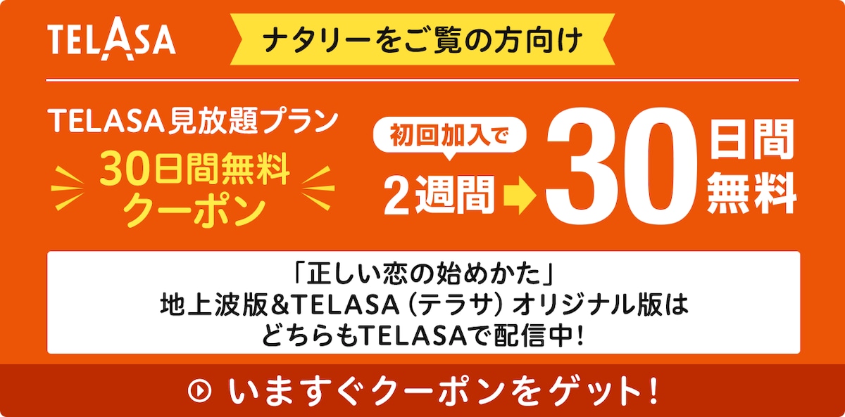 TELASA(テラサ)は、テレビ朝日の人気番組をはじめとした動画を配信するサービス。ドラマ、バラエティ、アニメ、特撮、スポーツ番組に加え、国内外の映画、ドキュメンタリーなど、新作やオリジナルを含む、豊富なラインナップを視聴できる。スマホやPCはもちろん、テレビの大画面でも視聴可能。月額料金は税込618円~。なお初回登録時、30日間無料でおためし視聴できるキャンペーンをナタリー限定で現在実施中。本記事内のバナーから飛ぶと、通常2週間の無料期間が30日間となる。