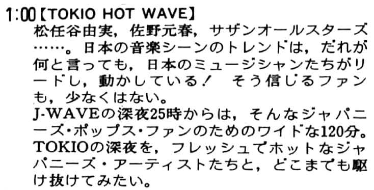 当時のラジオ番組欄を確認してみると、文字列として“J-POP”が登場したのは、1988年11月14日放送の番組「TOKIO HOT WAVE」の第2部パート「J-POPクラシックス」が初である。「TOKIO HOT WAVE」の番組自体は1988年10月最終週から放送しており、おそらく初めからこのJ-POPコーナーは存在していたはずだが、これ以前の番組欄には番組名しか載っていないため断言できず、具体的な番組内容がテキストで書かれたのはこの日が初となる。J-POPの誕生は1988年10月のどこか、公に文字になったのは11月14日。というところでいかがだろう。
