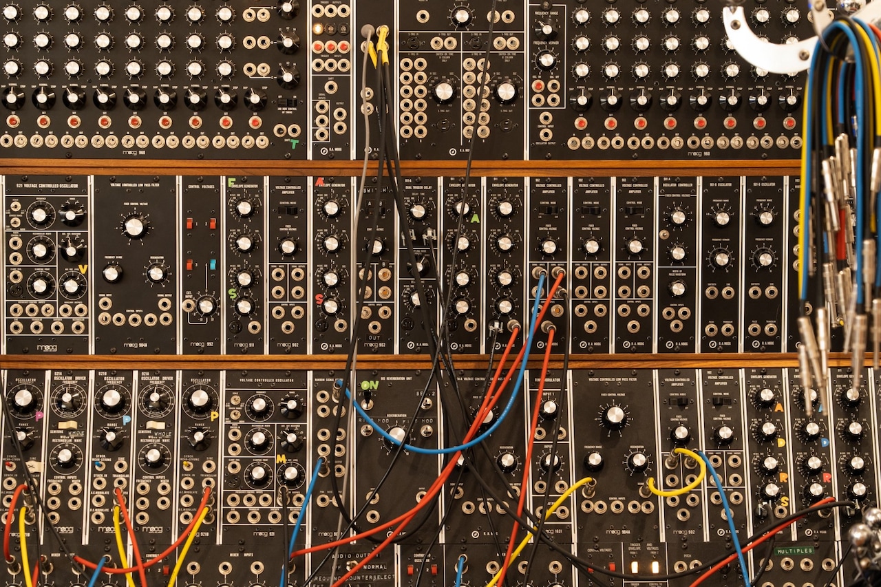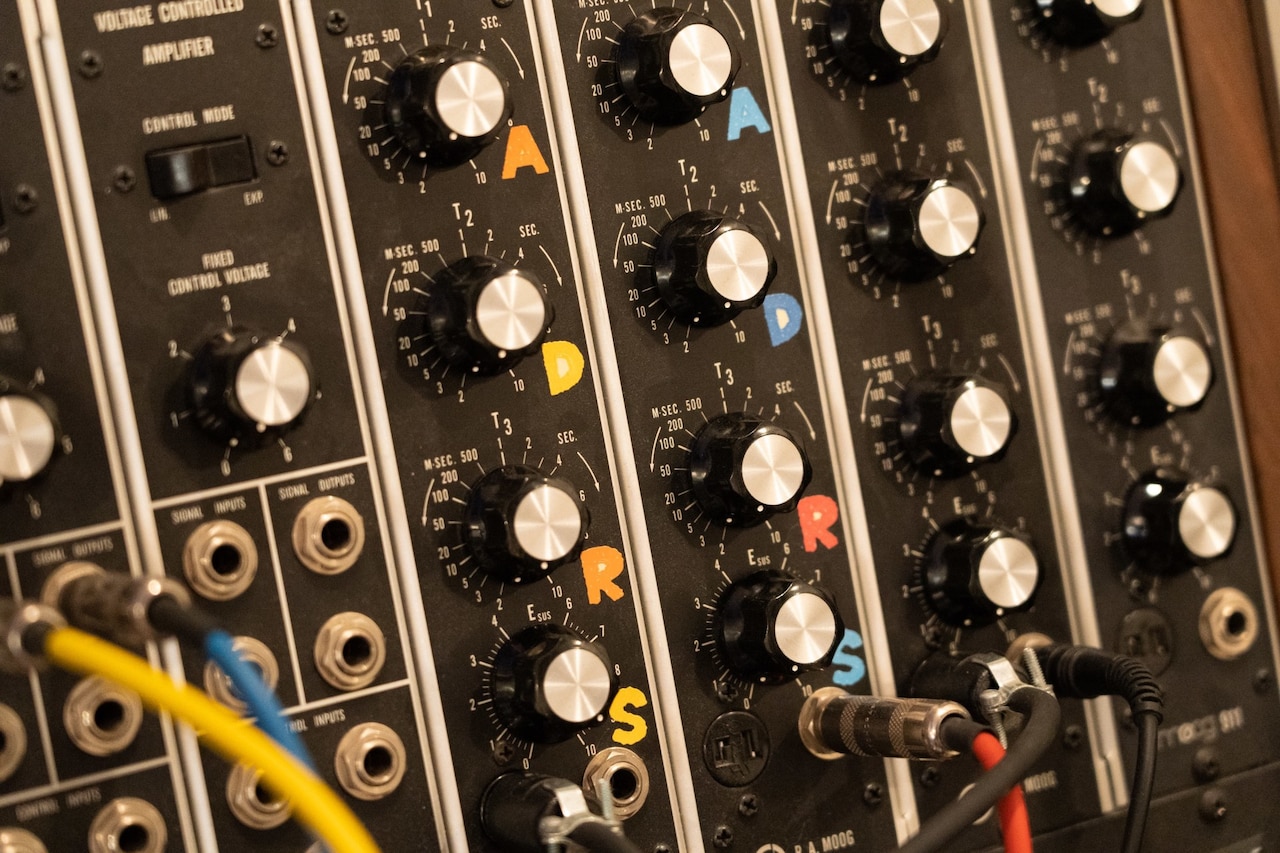 この“タンス”(大型モジュラーシンセの呼称)を起動すると、触る前の時点で音を発振します。でも本体だけだとできることはそれだけ。そこからこの楽器に内蔵されているいくつかのボルテージコントロール(電圧制御発振器)、いわゆる“オシレーター”を動かして音の波形を選択し、音色を決めて、さらにそれを鍵盤とつないで信号を送ることでメロディが生まれます。音の出力はアンプを通すことで調整するんですが、もっと強力な音を鳴らしたいと思ったときは、別のオシレーターにモジュラーケーブルをつないで高い音を出したり、音を重ねたり、フィルターをかけて音を変えたり。1つひとつモジュラーケーブルをつないで、配線を確認しながら調整していきます。