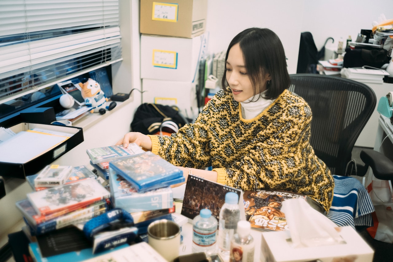 編集長のデスクの脇にはたくさんのゲームソフトが積まれていました。「いっぱいあって楽しそう!」と喜びつつ、のっちさんはそのタイトルを1つひとつチェック。「知らないゲームがいっぱいありますね……パッケージを見る限りだと『じんるいのみなさまへ』というのが気になります」。
