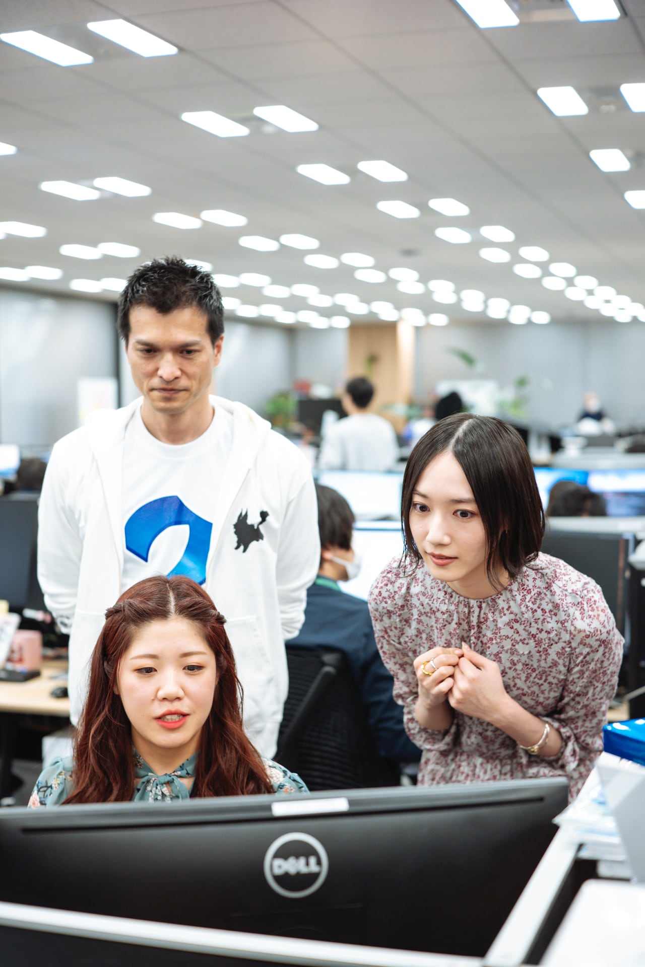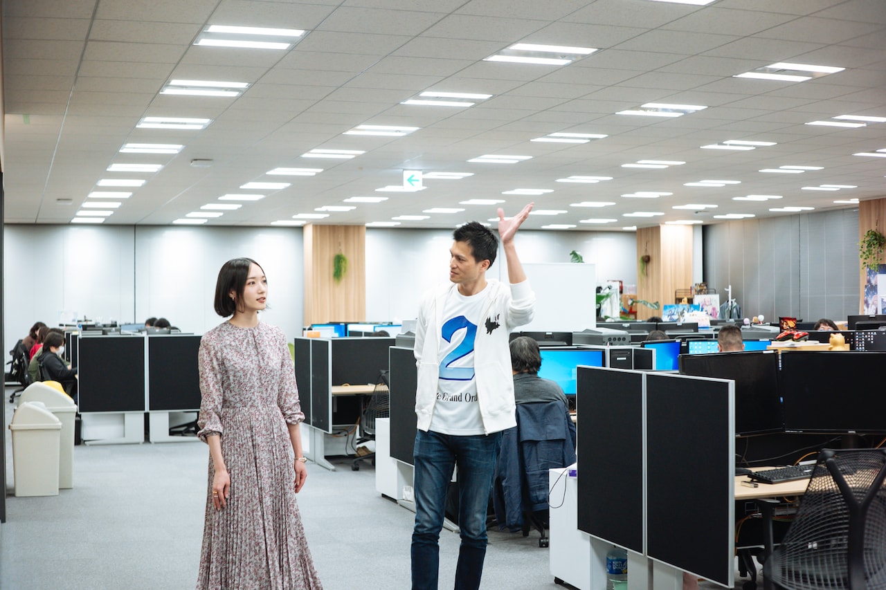 カノウさんに案内されて、のっちさんがまず訪れたのは、関係者以外立ち入り禁止の開発フロア。かなり広々とした室内でたくさんの社員がパソコンに向かっています(取材は2020年3月に実施)。皆さん集中して黙々と作業を進めているため、どことなく緊張感が漂います。