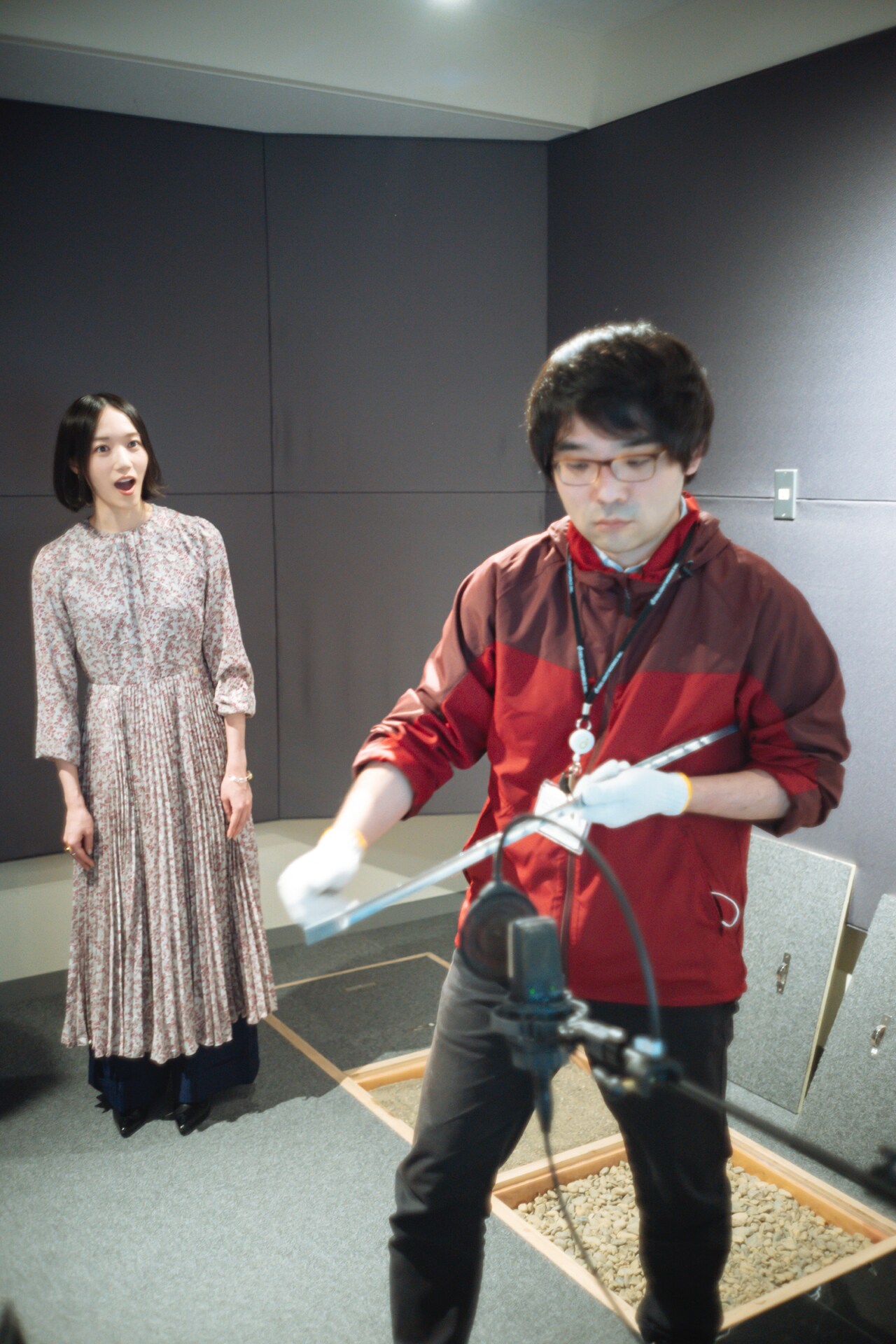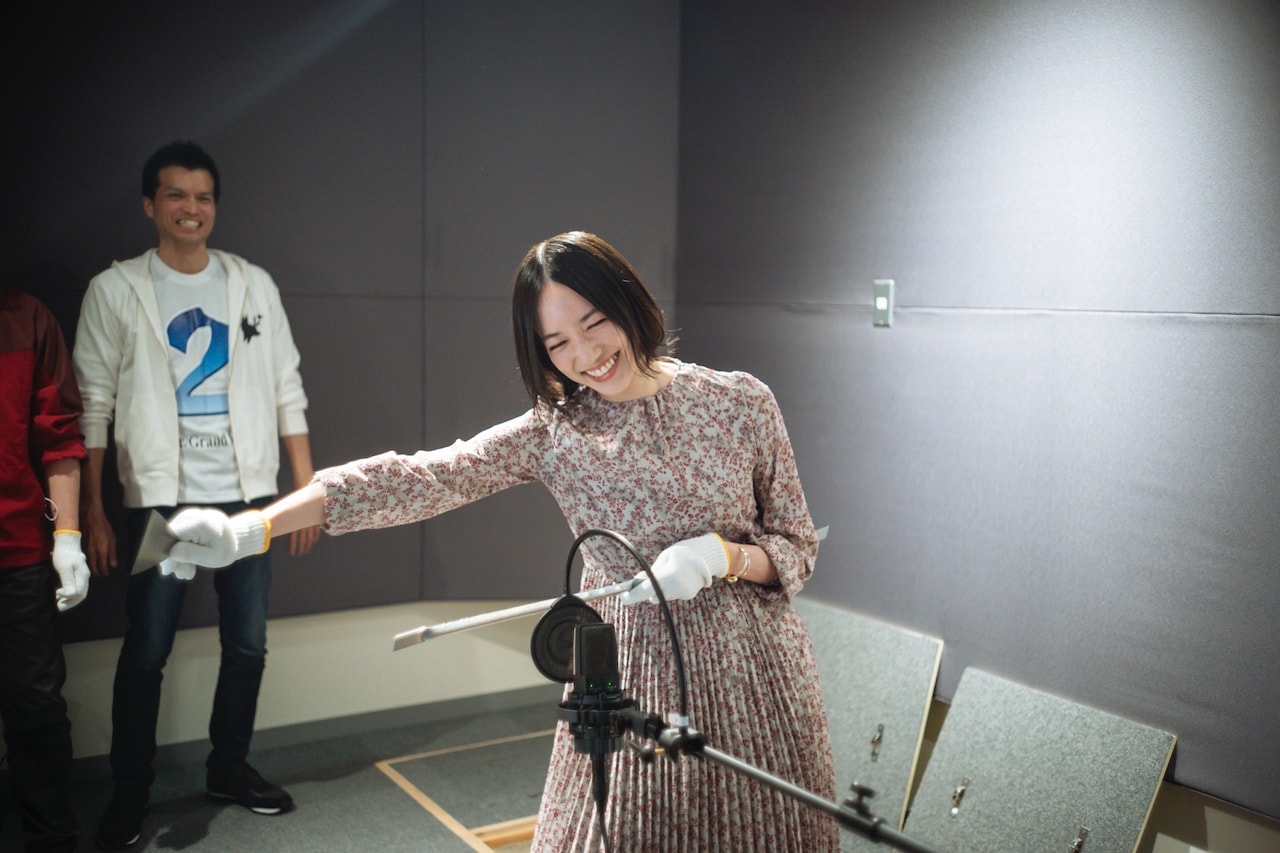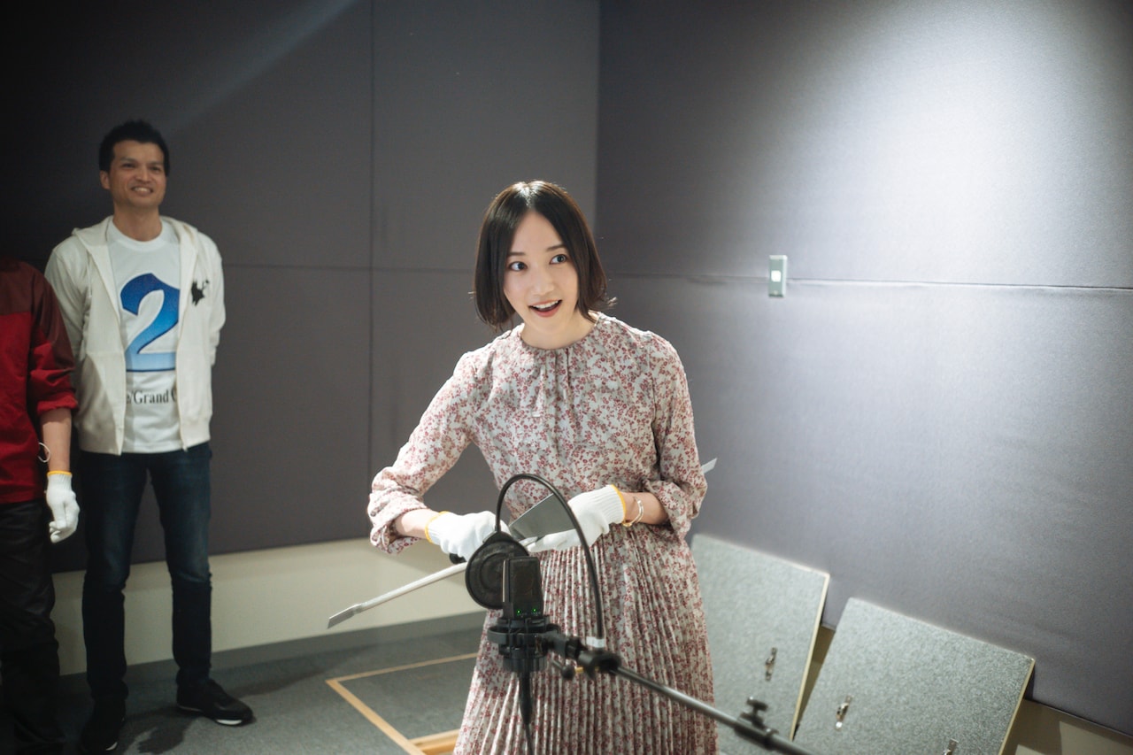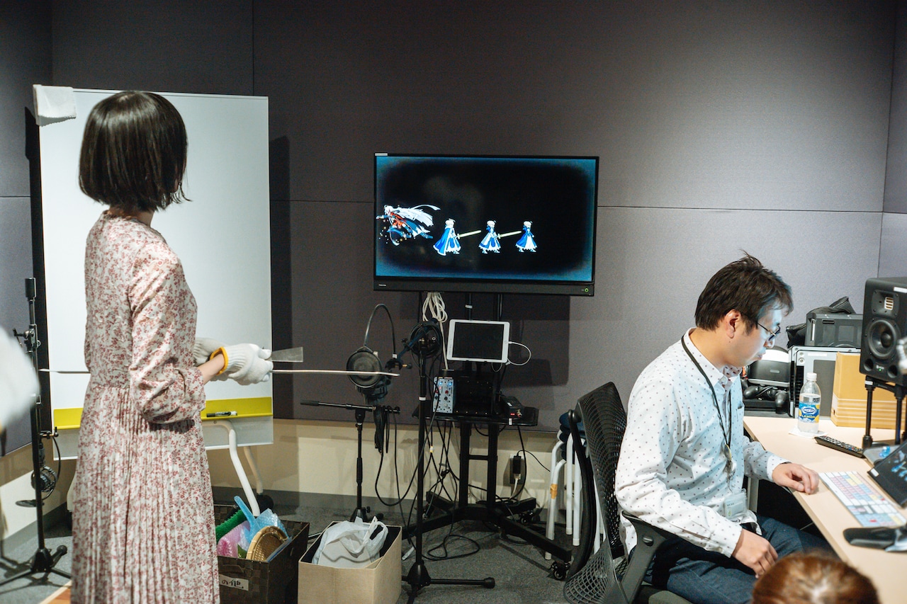 ここでフォーリーサウンドの担当者が、沖田総司〔オルタ〕の宝具演出の音作りを実演。火バサミに金ベラをこすり付けると、まるで太刀で斬るような硬く鋭い音が響き渡り、のっちさんは驚きの声を上げました。