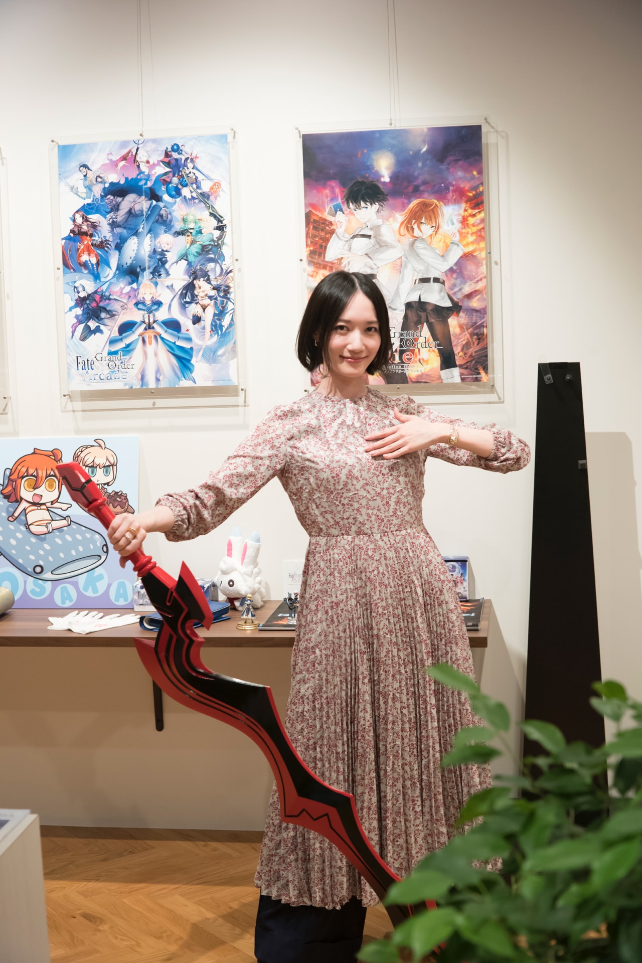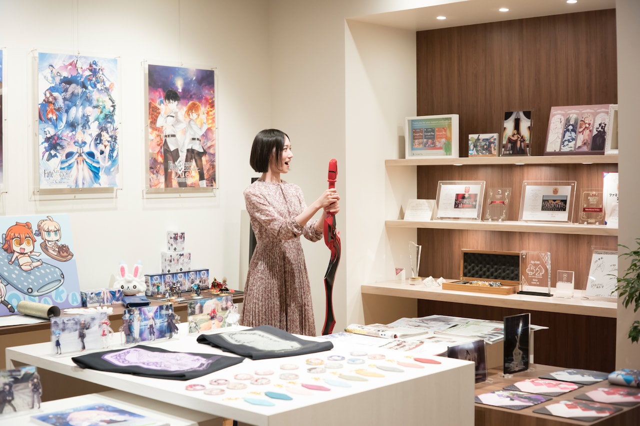 エントランスからすぐのロビーには、FGO関連のさまざまなグッズなどが陳列されています。大量のグッズを1つひとつチェックしながら早くもテンションが上がるのっちさん。赤セイバーことネロ・クラウディウスの実物大の大剣が飾られているのを発見し、右手に構えてポーズを決めました。