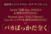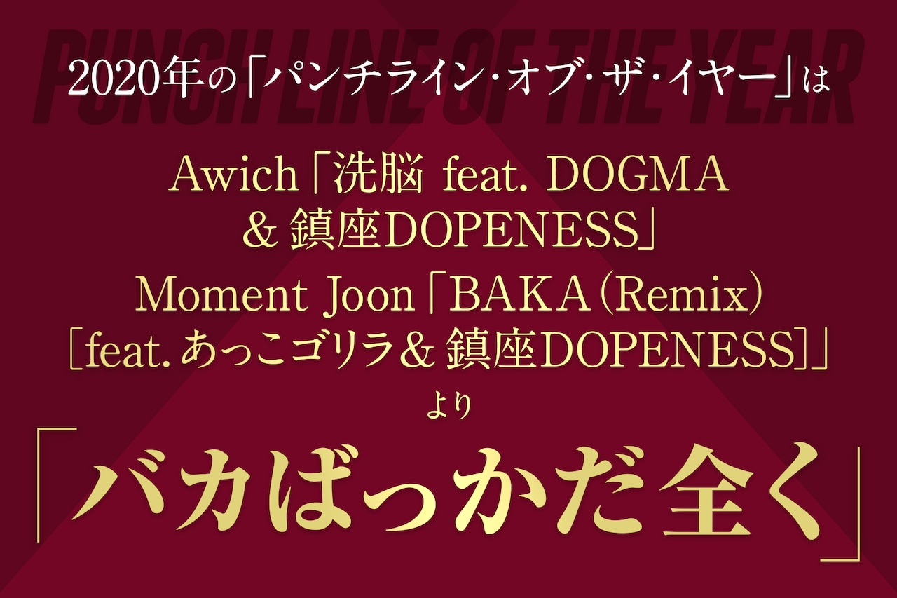 斎井 僕もそれがいいと思いますね。「洗脳」が収録されたAwichのアルバム「孔雀」は2020年1月11日発売で、「BAKA(Remix)」が収録されたMoment Joonのアルバム「Passport & Garcon DX」は12月30日発売なので、2020年はAwichの「バカばっかだ全く」で始まって、鎮座DOPENESSの「バカばっかだ全く」で締めくくられたわけです。