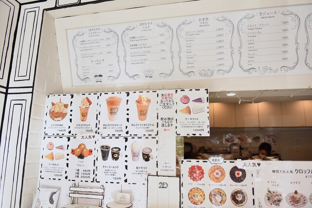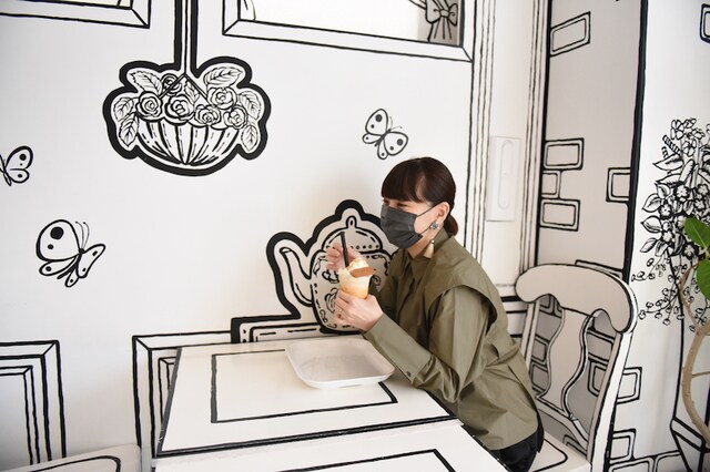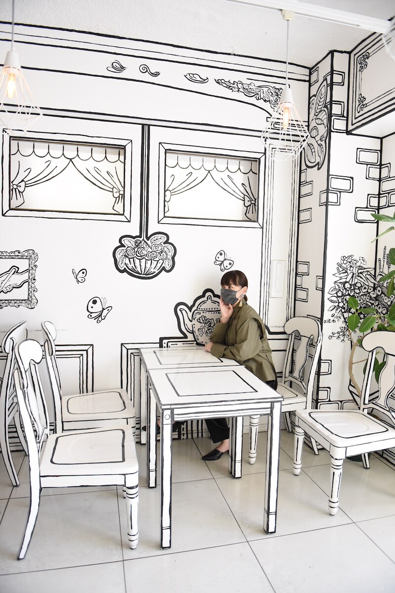 最初に土岐さんが向かったのは、りょう子ちゃんがプッシュしていた2D Cafe。お店に到着すると、白と黒で統一された店内にパッと目を引かれます。