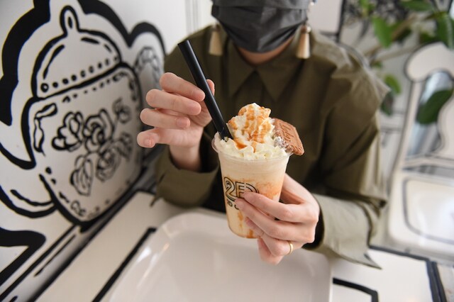 キャラメル味のドリンクに、たっぷりの生クリームとビスケットがライドオン。土岐さん、さっそく実食。