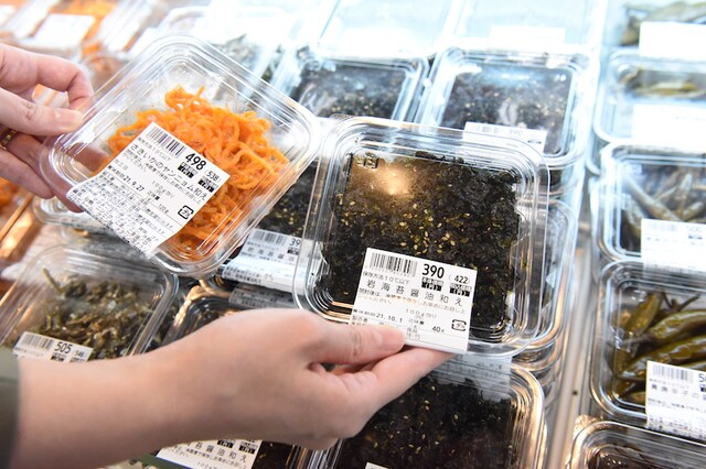 お惣菜コーナーにも韓国らしいメニューがいっぱい。「これおいしいから、ぜひ買って帰ってください」と土岐さんが紹介してくれたのは、「さきいかとヤンニョム和え」と「岩海苔醤油和え」。