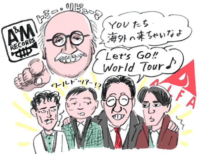 細野 トミー・リピューマは、A&Mレーベル(アメリカの音楽レーベル)の傘下で、ホライズンっていうレーベルを始めたばかりだった。ドクター・ジョンとかが移籍したりしてきて、ヘンテコリンなレーベルだった。で、それまでA&Mレーベルは日本ではキングレコードと契約していたんだけど、YMOの1作目を作っているときに、A&Mがアルファに移ったってニュースを知ったんだ。そういう経緯があって、「1枚目はA&Mから出すことになるんだろうな」ってなんとなくわかっちゃったわけ。その後は1カ月、2カ月単位でいろいろ話が展開していって、川添象郎(音楽プロデューサー)さんって人が入ってきてツアーを計画して、あれよあれよという間にワールドツアーに出ちゃった。だから、ワールドツアーは村井さんの考えなんだよね。