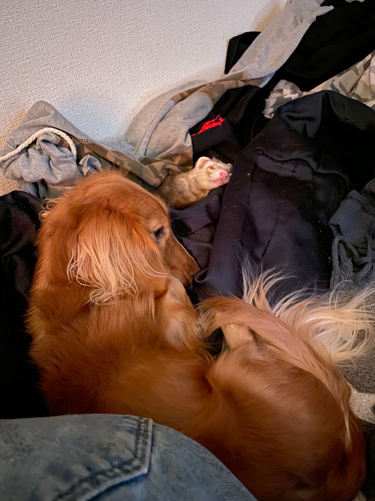 ネオはひたすらついてくるんです。ボールを追いかけるより私の足を追いかけたり、ラッキーと追いかけっこしてます。ネオもラッキーもフェレットとダックスなので隙間や穴も大好きでよく物陰で寝てしまって迷子になります笑