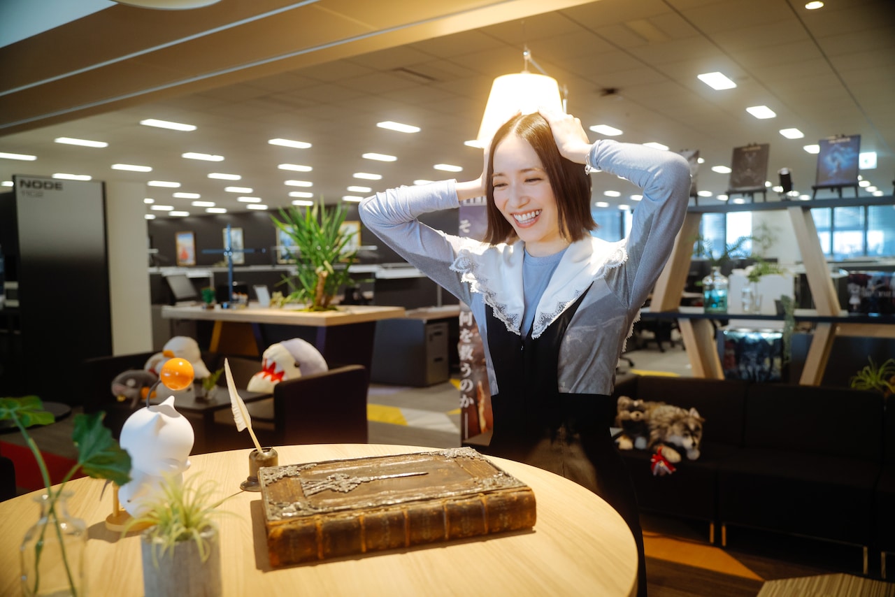 「こんなものがあるんだ! くぅーっ!」とのっちさんが声を上げたのは、革表紙の本と羽根ペン。これらは「FF16」のCM撮影のために作られた小道具ですが、ゲーム内のあるシーンでまったく同じものを見たというのっちさんは「ええ……? CMに、これが、映ってたんですか……? なんてことなの!」と動揺しつつ、「盛れる!」と言いながら撮影を楽しんでいました。