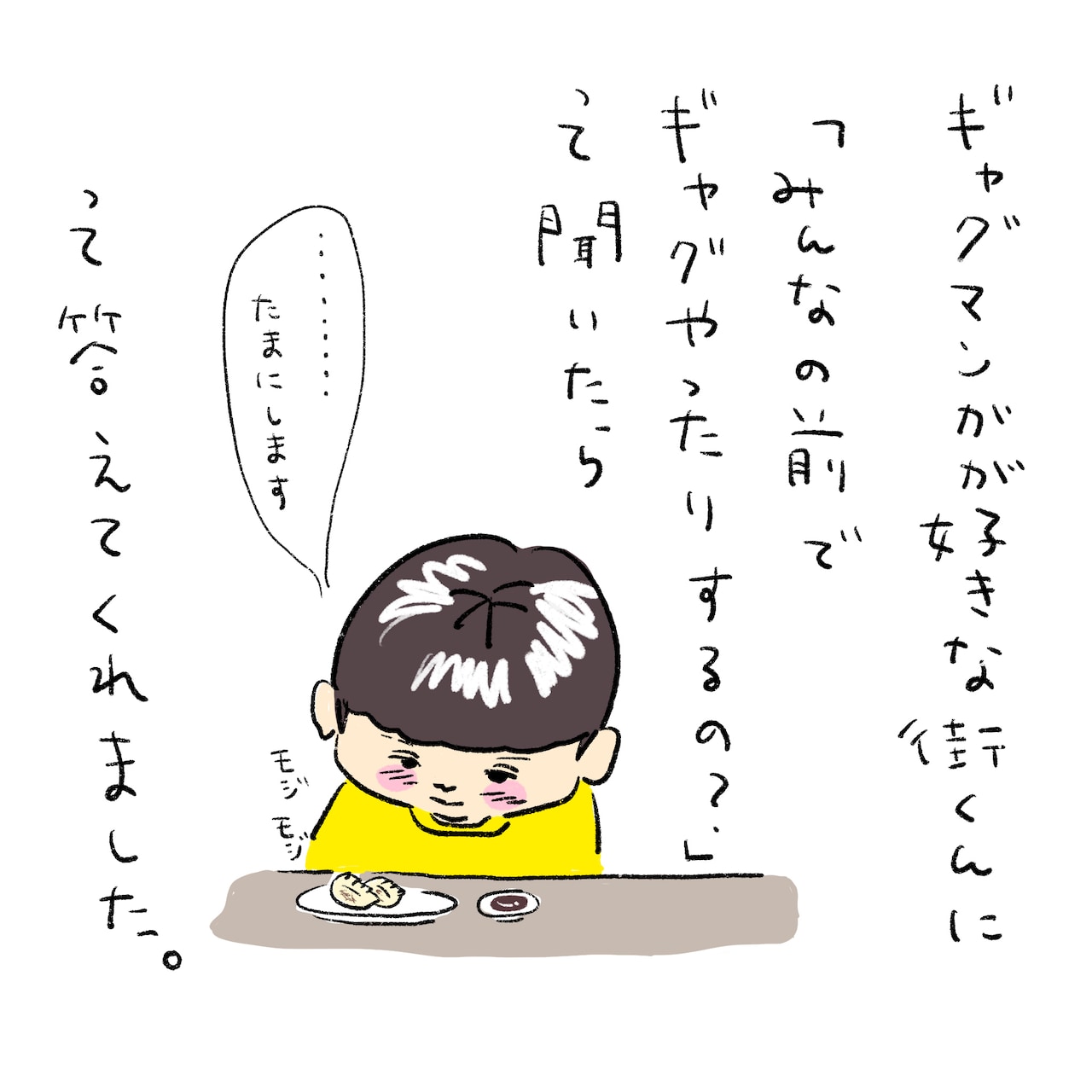 街くん、餃子を食べたあたりからポツポツと話し始めた……と思ったら突如つぶやいた謎のひと言。どうやら読んでいるマンガで覚えたフレーズだったようです。
