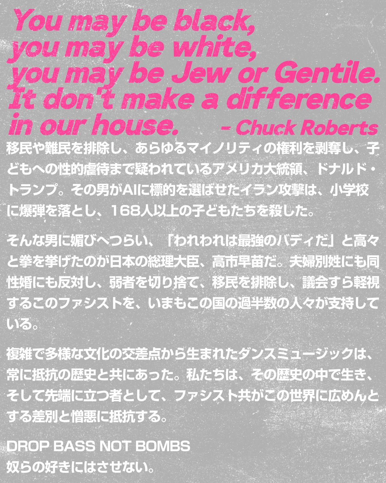 今回の告知には「BLOCK PARTY AGAINST FASCISM, RACISM, TAKAICHI AND TRUMP.」とも記されていた。ブロックパーティとは、1970年代のニューヨークで始まったもの。ブロック(街区)の路上にスピーカーを持ち出し、誰でも参加できるパーティを開く。そこに近所の人々が集まり、踊り、交流する。ブロックパーティとは路上で人々を結び付けるプラットフォームのようなものだ。ヒップホップはそこから始まった。ジャマイカのサウンドシステム文化も、その土台にある。ジャーナリスト / 作家のジェフ・チャンは鋭くもこう書いている。