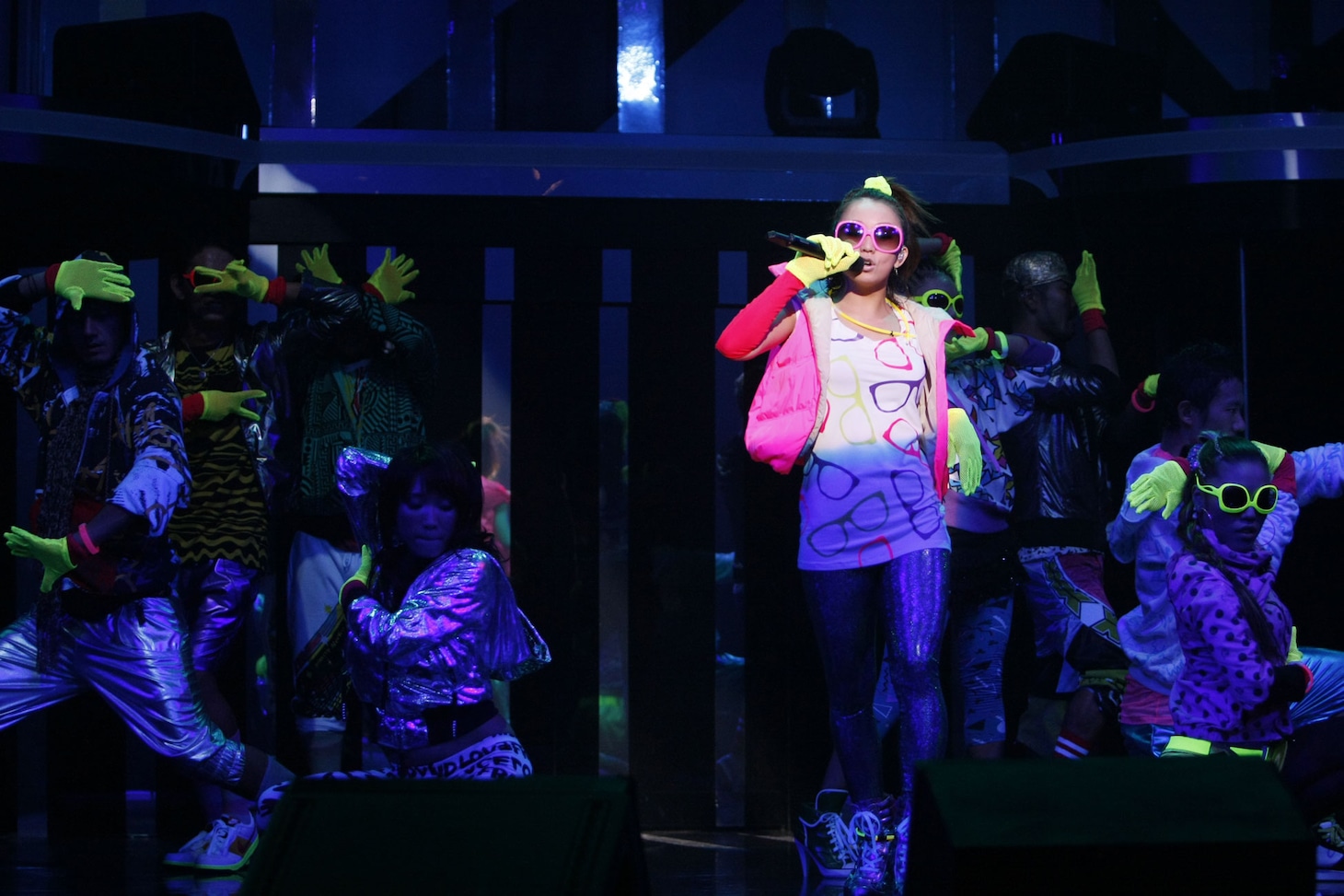 • 1幕ではセクシー系、2幕では80年代を意識したパンキッシュなコスチュームでパフォーマンスを行った倖田來未。3幕ではネオンサイバーをコンセプトにした衣装に身を包み歌やダンスだけでなくファッションでもファンを楽しませた。