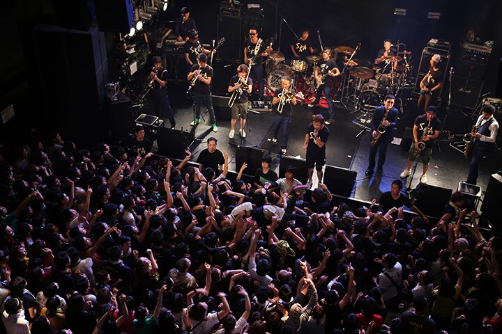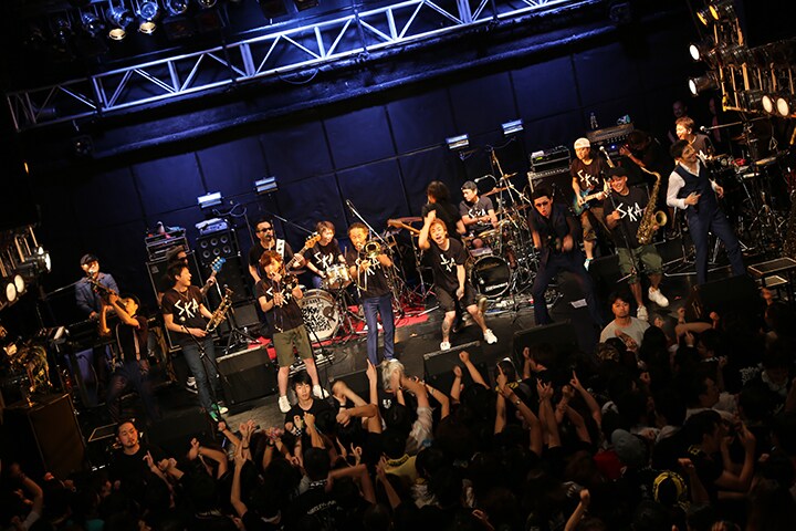 KEMURIの余韻に浸る間もなく、スカパラのライブへ突入。スカパラのオープニングナンバーは映画「ミッション:インポッシブル」のテーマ曲をスカパラ流にアレンジした「Mission Impossible Theme」だ。彼らはKEMURIの白熱したパフォーマンスに負けじと、冒頭からエンジン全開でフロアの熱度を上げていく。「ルパン三世'78」では大森はじめ(Per)がフロアのオーディエンス目がけてステージからダイブし、場内の熱狂ぶりに拍車がかかる。