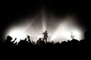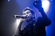 そしていよいよCrossfaithのパフォーマンスへ。ステージ前方に張られた幕が落ちるとともに、彼らは1曲目「We Are The Future」をドロップ。すると次第にモッシュ、ダイブ、ヘッドバンギング、ハンドクラップが巻き起こり、場内のボルテージは一気に最高潮に。Kenta Koie(Vo)の「O-EAST、始めようぜ!」の言葉から「Hounds Of The Apocalypse」へとなだれ込むと、「Jagerbomb」ではKazuki Takemura(G)とHiroki Ikegawa(B)がステージ上を動き回り、Terufumi Tamano(Program, Vision)がフロアにダイブ。フロア中央付近で観客同士がぶつかり合う激しいウォールオブデスが発生した「Countdown To Hell」、浮遊感のある電子音が印象的なナンバー「Counting Stars」と彼らの熱演は続く。